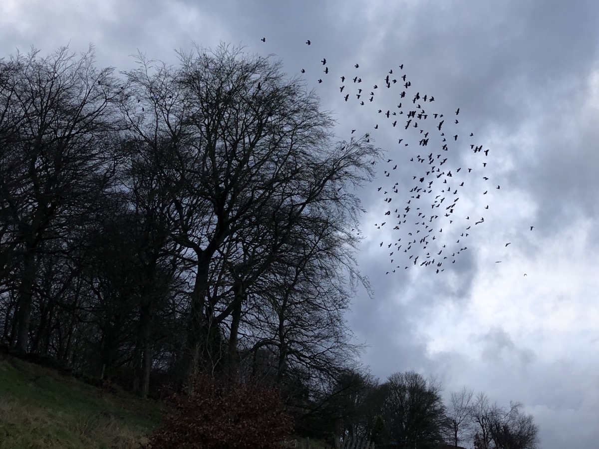Took Rosie the reluctant cocker spaniel for a drag up to Crow Nest Wood shortly before dusk. Jackdaws were congregating in one of the beech trees at the edge of the wood. To Rosie’s relief, I decided to stand and watch them for a while, as they chaked and fidgeted. Small groups of new birds flew in sporadically from different directions. As each new group neared the roost, the birds in the tree called out greetings. Then, after ten minutes or so, for no reason I could fathom, an alarm call from a single bird was duplicated and spread in a split second throughout the roost. All the birds took flight, amid a clamour of squarks.